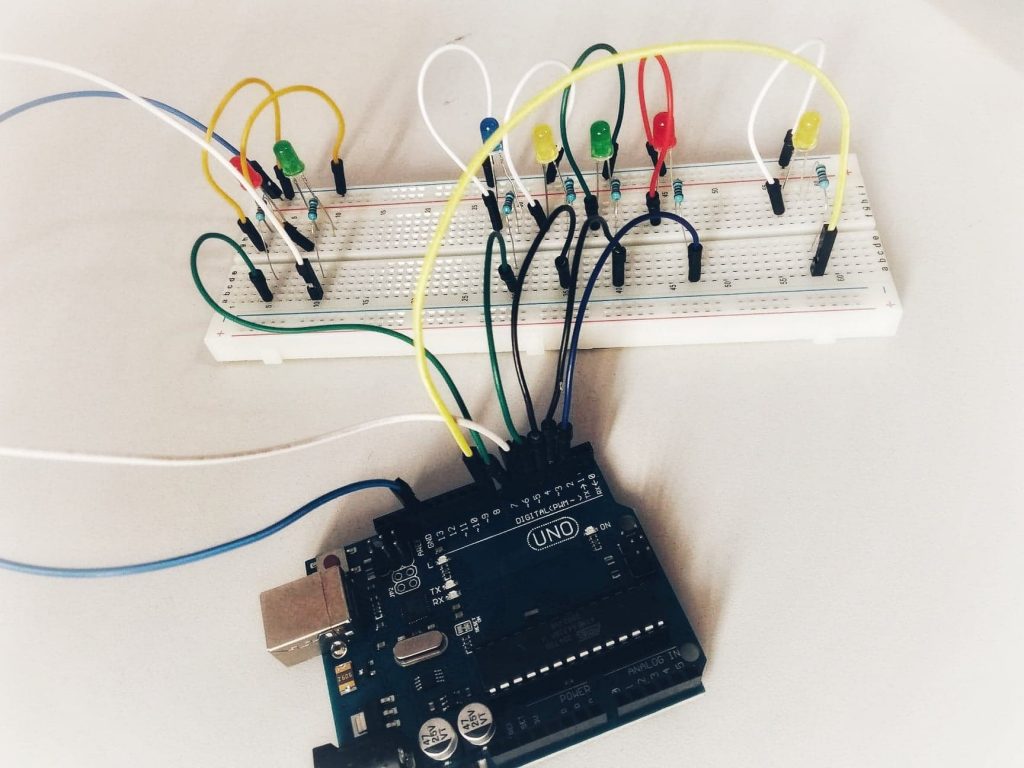Pe breadboard vor fi plasate led-urile și rezistențele. Alimentarea plăcii Arduino și transferul de date către aceasta se realizează printr-un cablu USB de tip A-B.