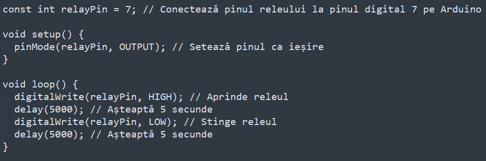 Dacă dorești să controlezi un invertor cu ajutorul unui microcontroler precum Arduino, poți face acest lucru prin intermediul unui releu sau un modul de comutare. În acest caz, aici ai un exemplu simplu de cod care poate fi folosit pentru a comuta un releu ON și OFF: