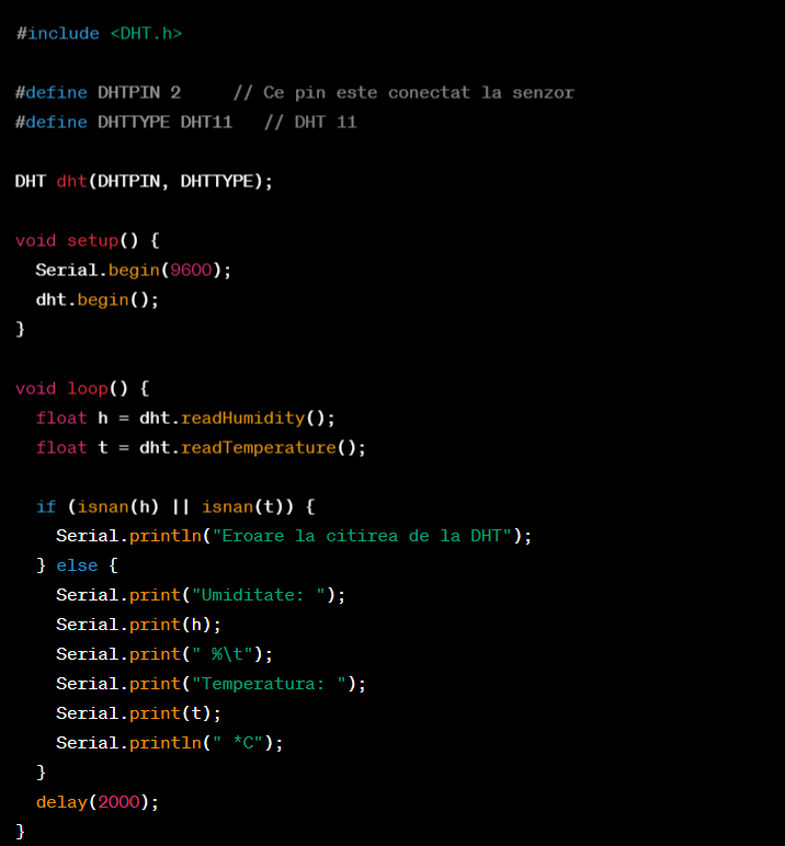 Acest cod măsoară temperatura și umiditatea o dată la două secunde și le afișează pe monitorul serial.