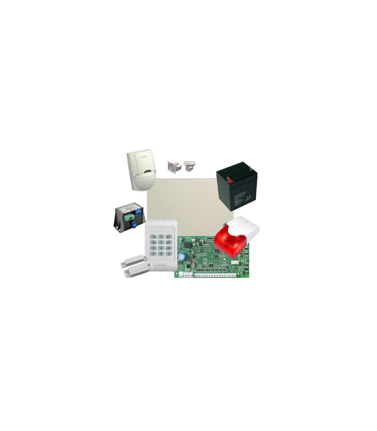 Kit alarma la efractie DSC cu sirena interioara Kitul contine: o centrala de alarma DSC PC1404 cu tastatura si cabinet un transformator AWT830 un acumulator 12V / 4Ah un senzor de miscare DSC LC-100PI un suport original LC-MBS pentru senzorul de miscare o sirena de interior LD-95 cu flash un contact magnetic aparent CM-31NC-ALB