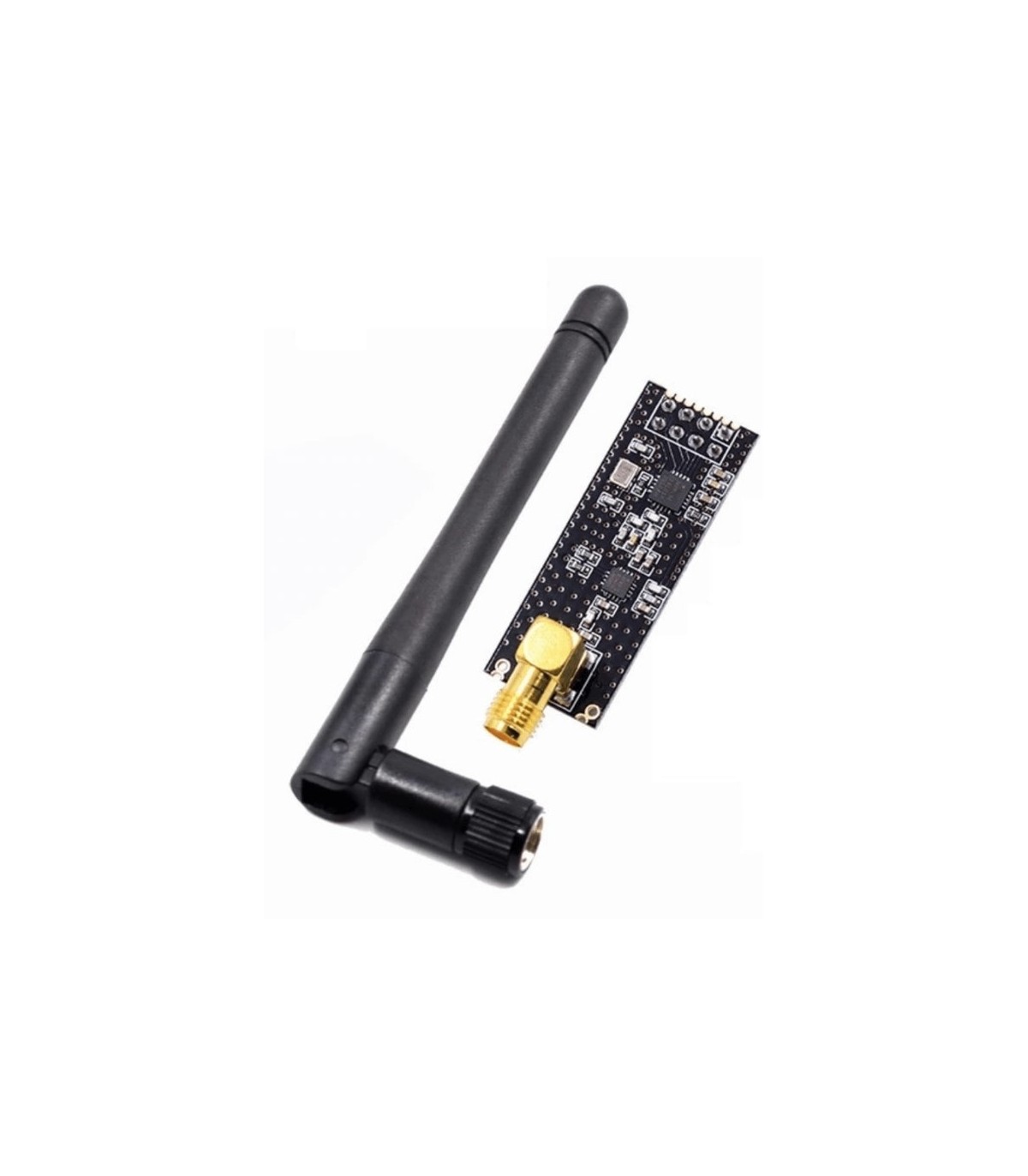 Acest modul utilizează 2.4GHz transceiver, nRF24L01 . Acest IC transceiver funcționează în banda de 2,4 GHz și are multe caracteristici noi! Această placă dispune de un conector SMA polarizat invers pentru o gamă maximă de frecvențe RF. Cu antena externă poate ajunge la o distanță mai mare decât cea fără. Acest modul vine cu antena 2.4G (2DB), cu o viteză de transmisie de 250Kbps în aer liber ce poate atinge o distanță de comunicare de 800-1000 metri.