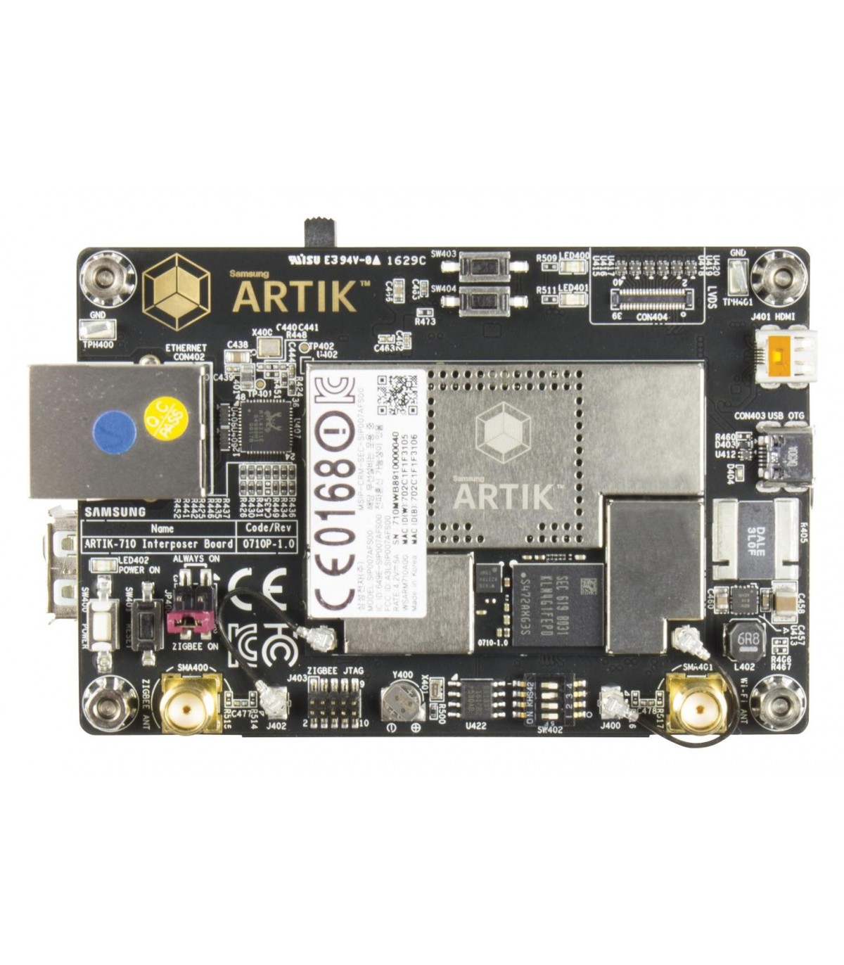 Modul de dezvoltare ARTIK 530s, placă interpozitivă ARTIK 530 / 530s, placă platformă, placă de interfață, două antene (una 802.15.4, una BT / Wi-Fi).
