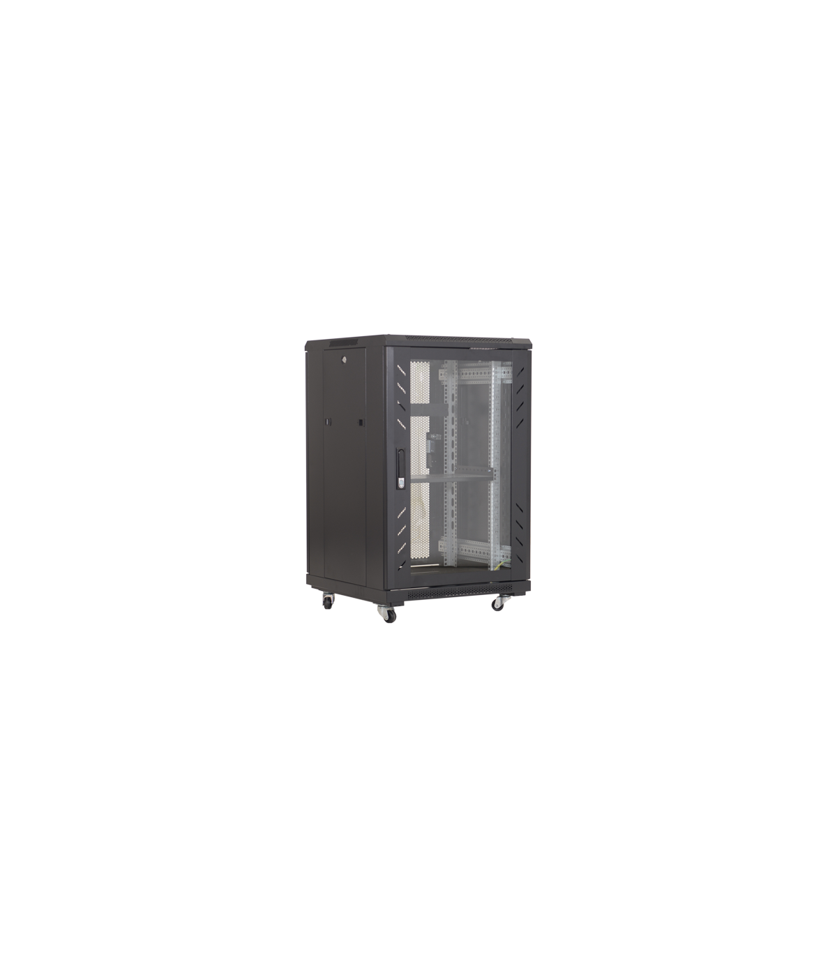 Cabinet metalic neasamblat de podea ce permite instalarea echipamentelor standard 19' dar si a celor pentru CCTV, CATV prin utilizarea de rafturi aditionale.