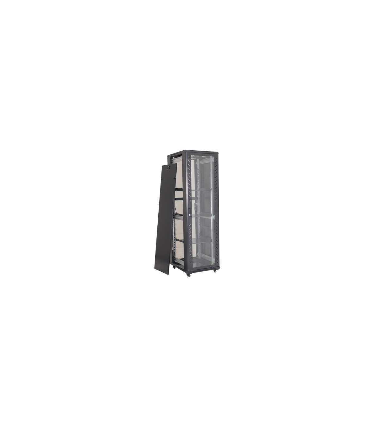 Cabinet metalic neasamblat de podea ce permite instalarea echipamentelor standard 19' dar si a celor pentru CCTV, CATV prin utilizarea de rafturi aditionale.