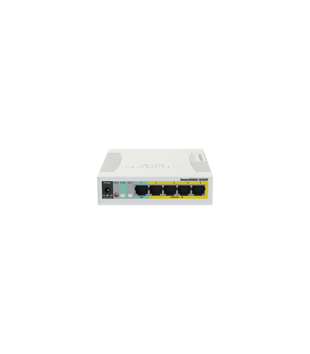 RB260GSP este un switch mic din clasa SOHO, cu microprocesor Atheros AR8327. Are 5 porturi Gigabit (din care 4 porturi PoE) si 1 port SFP. Este testat si recomandat a fi folosit cu modulele SFP urmatoare: S-85DLC05D, S-31DLC20D si S-35/53LC20D, care se achizitioneaza separat.