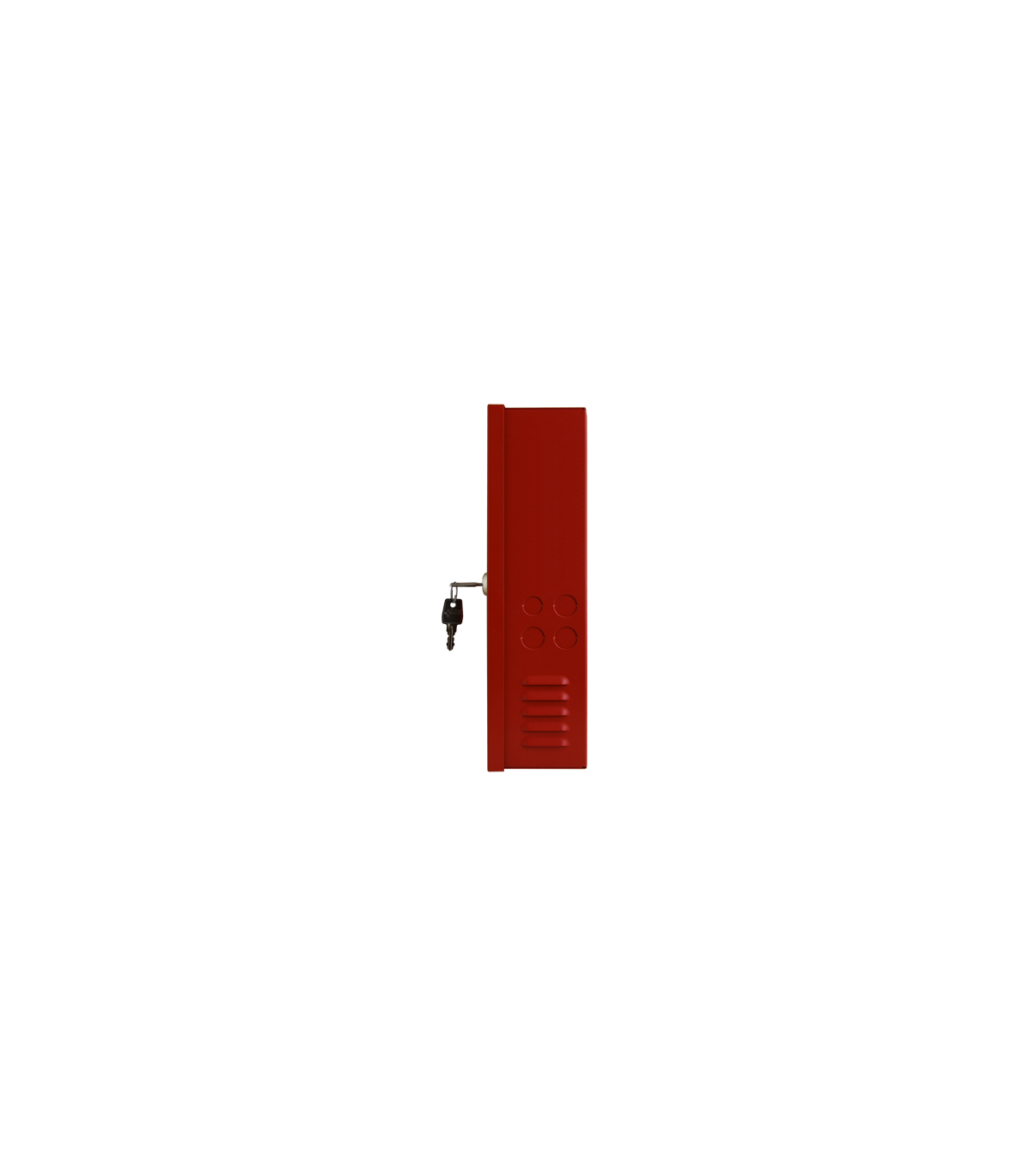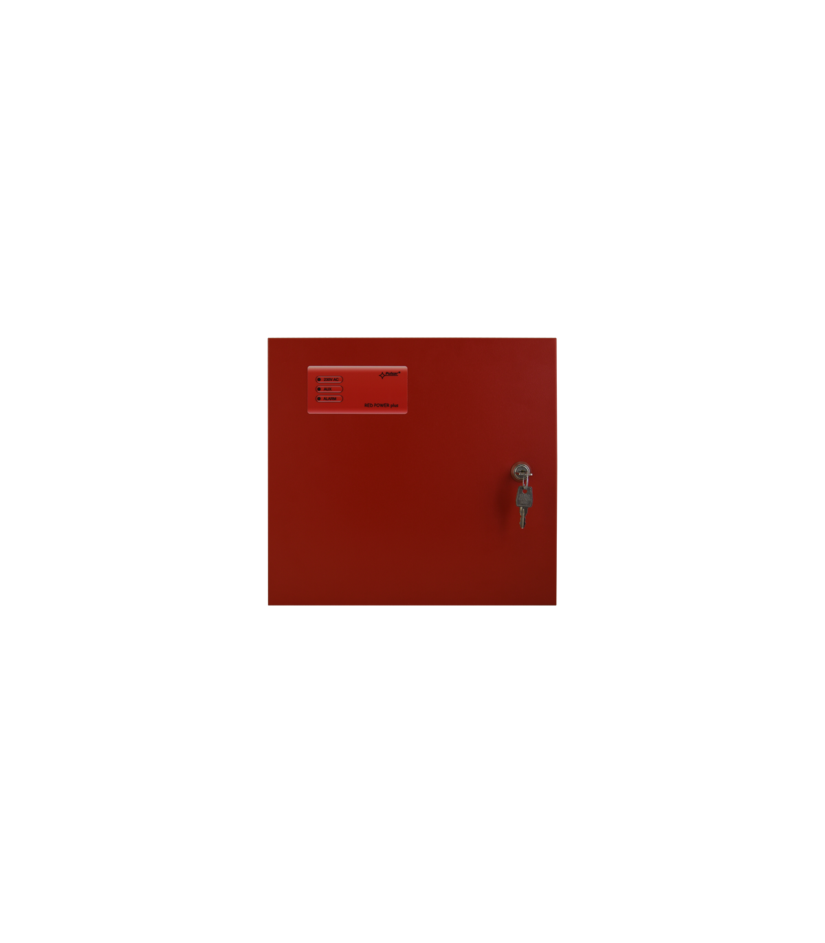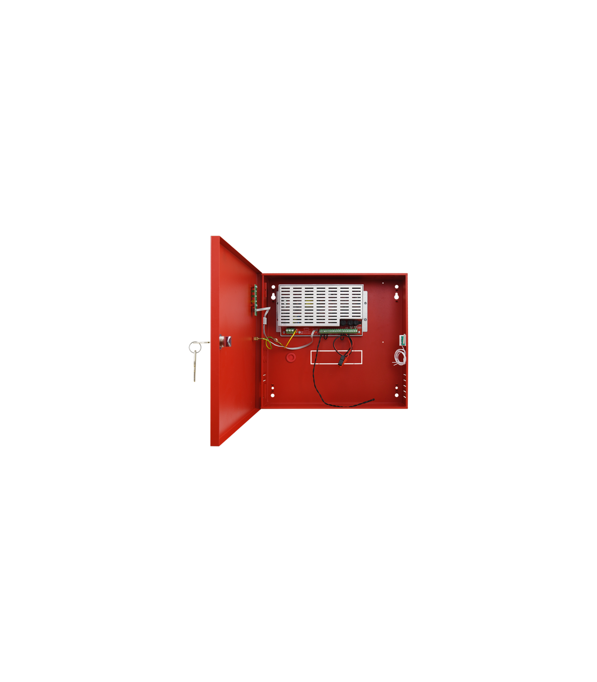 Sursa auxiliara pentru sistemele de incendiu, montare aparenta, incuietoare cu cheie, carcasa metalica rosie.