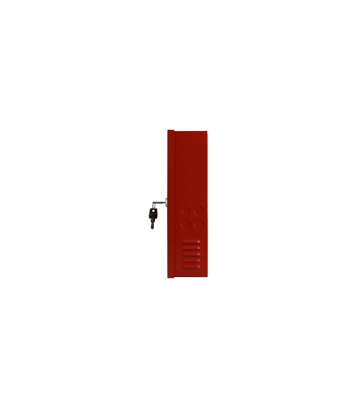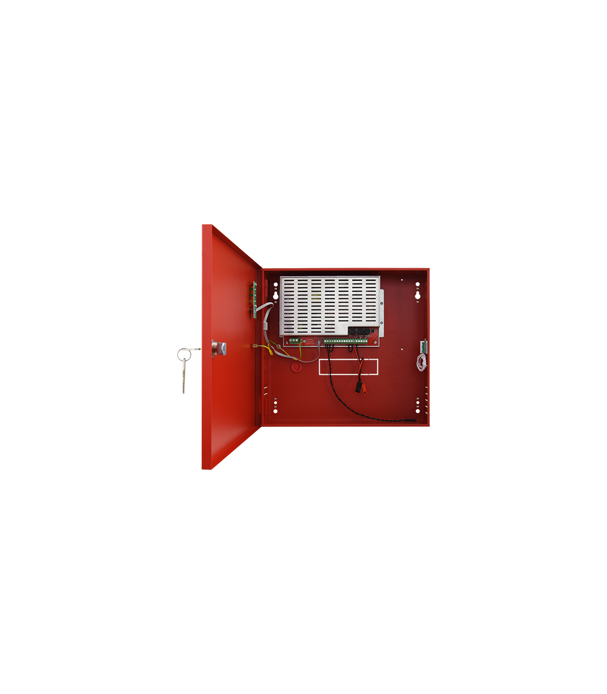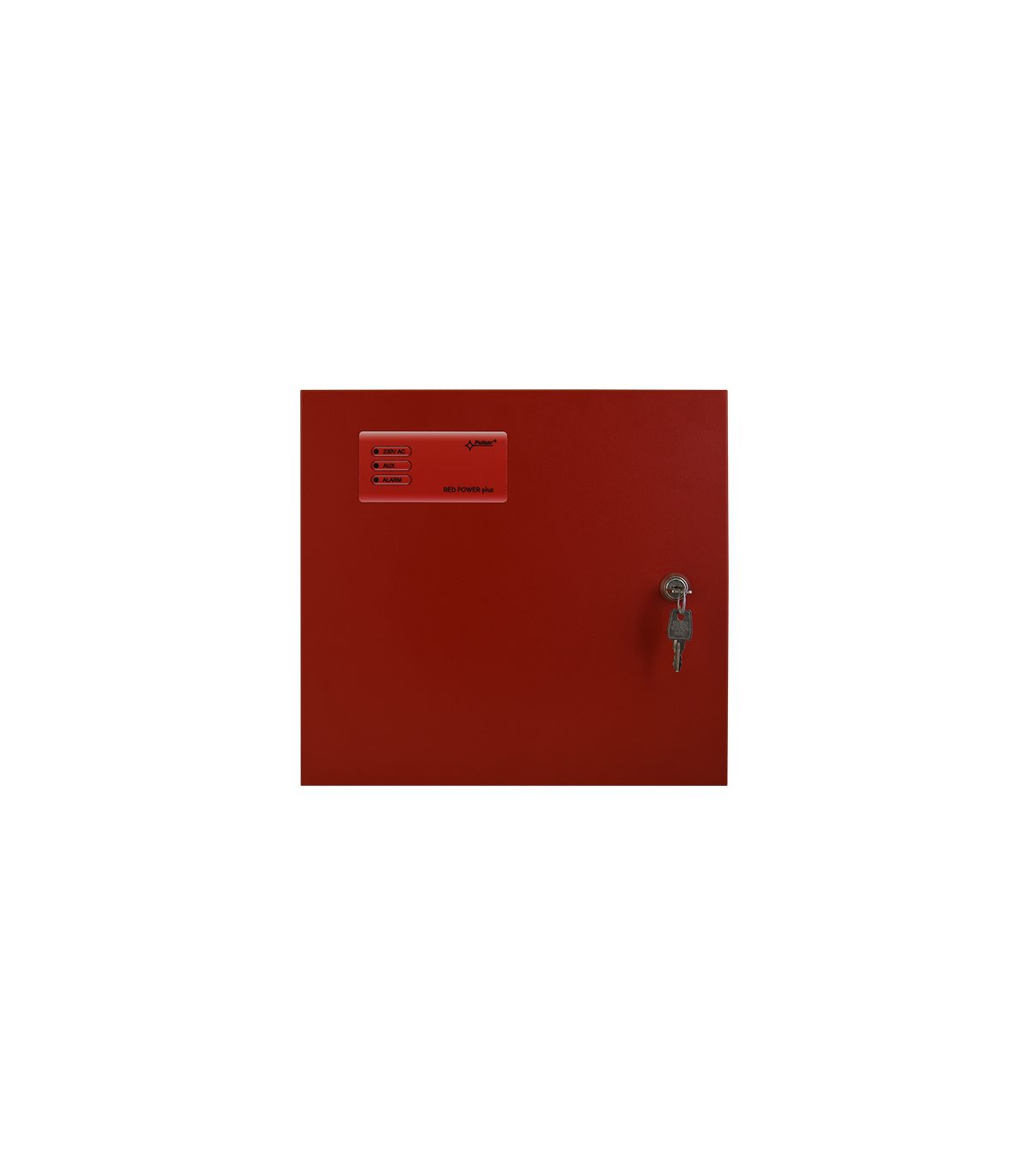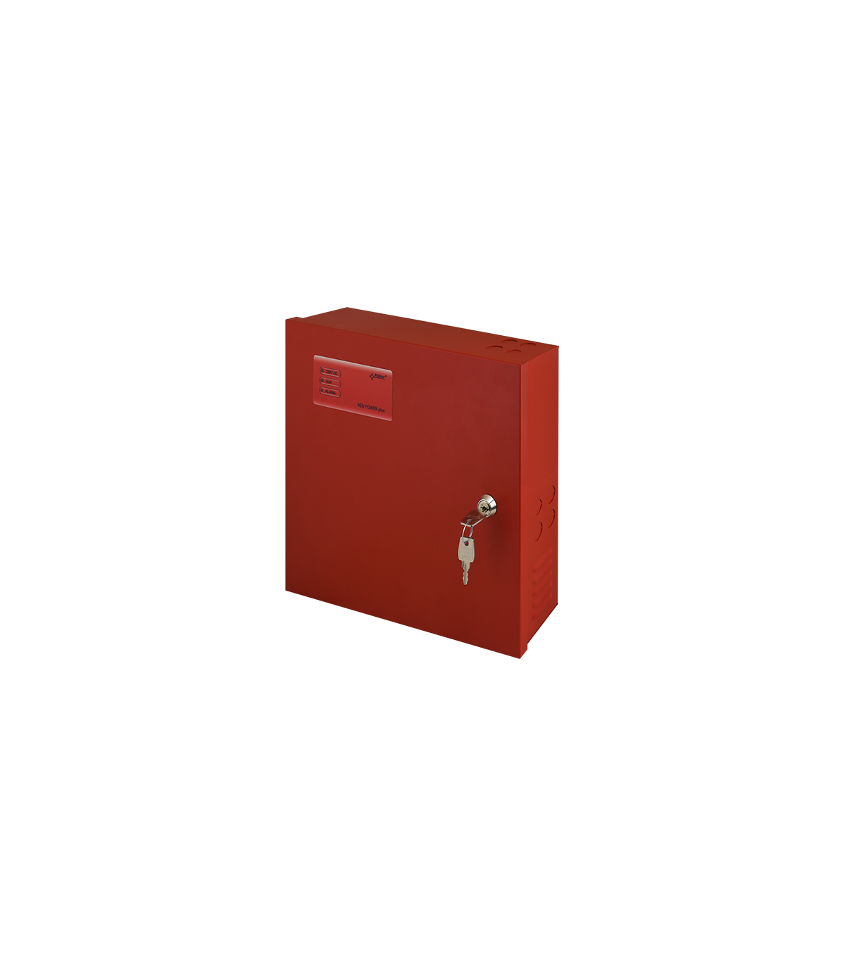 Sursa auxiliara pentru sistemele de incendiu, montare aparenta, incuietoare cu cheie, carcasa metalica rosie.