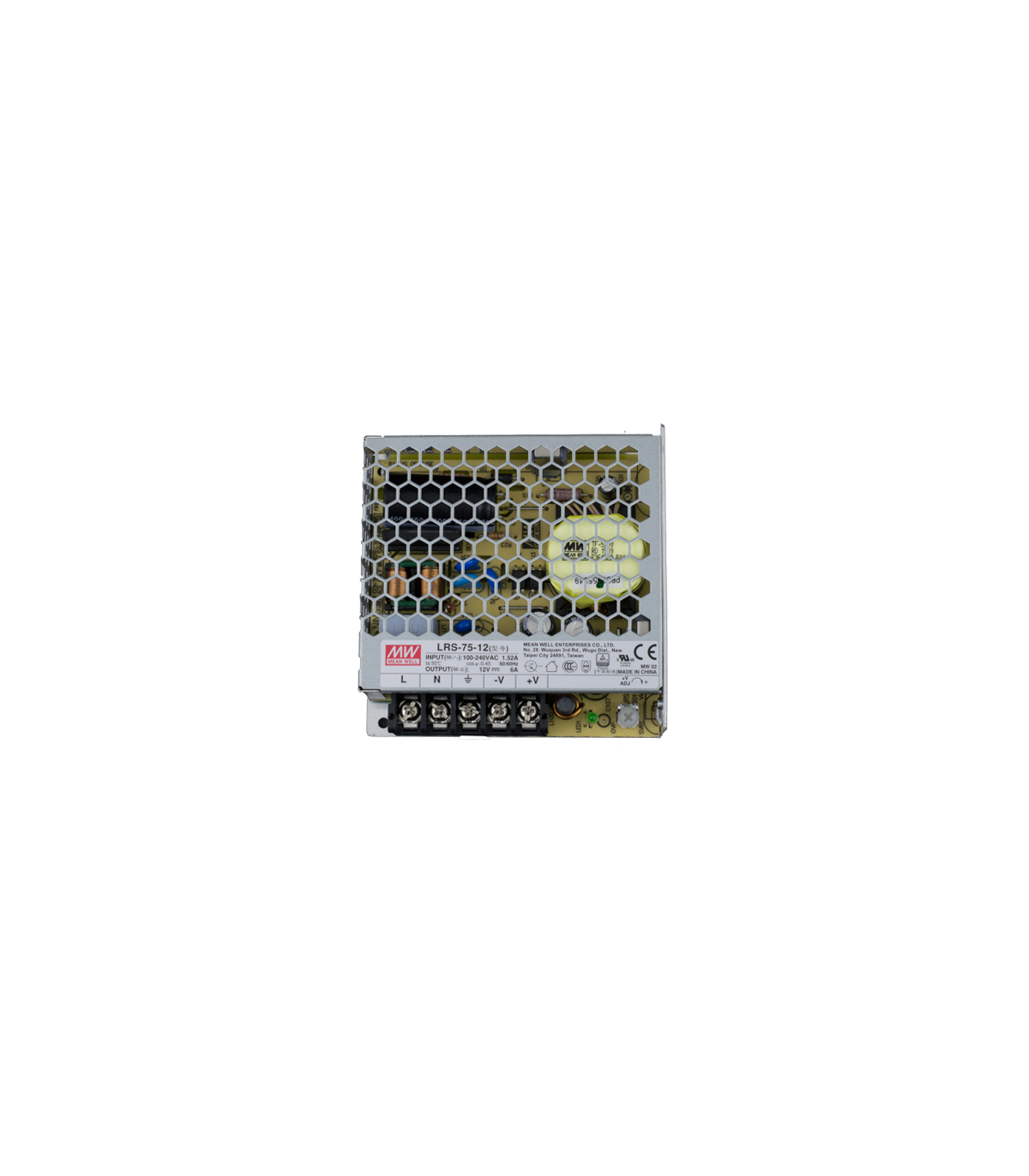 Sursa de alimentare in comutatie MeanWell reglabila intre 10.2 ~ 13.8V, si un curent maxim de pana la 6A (72W).