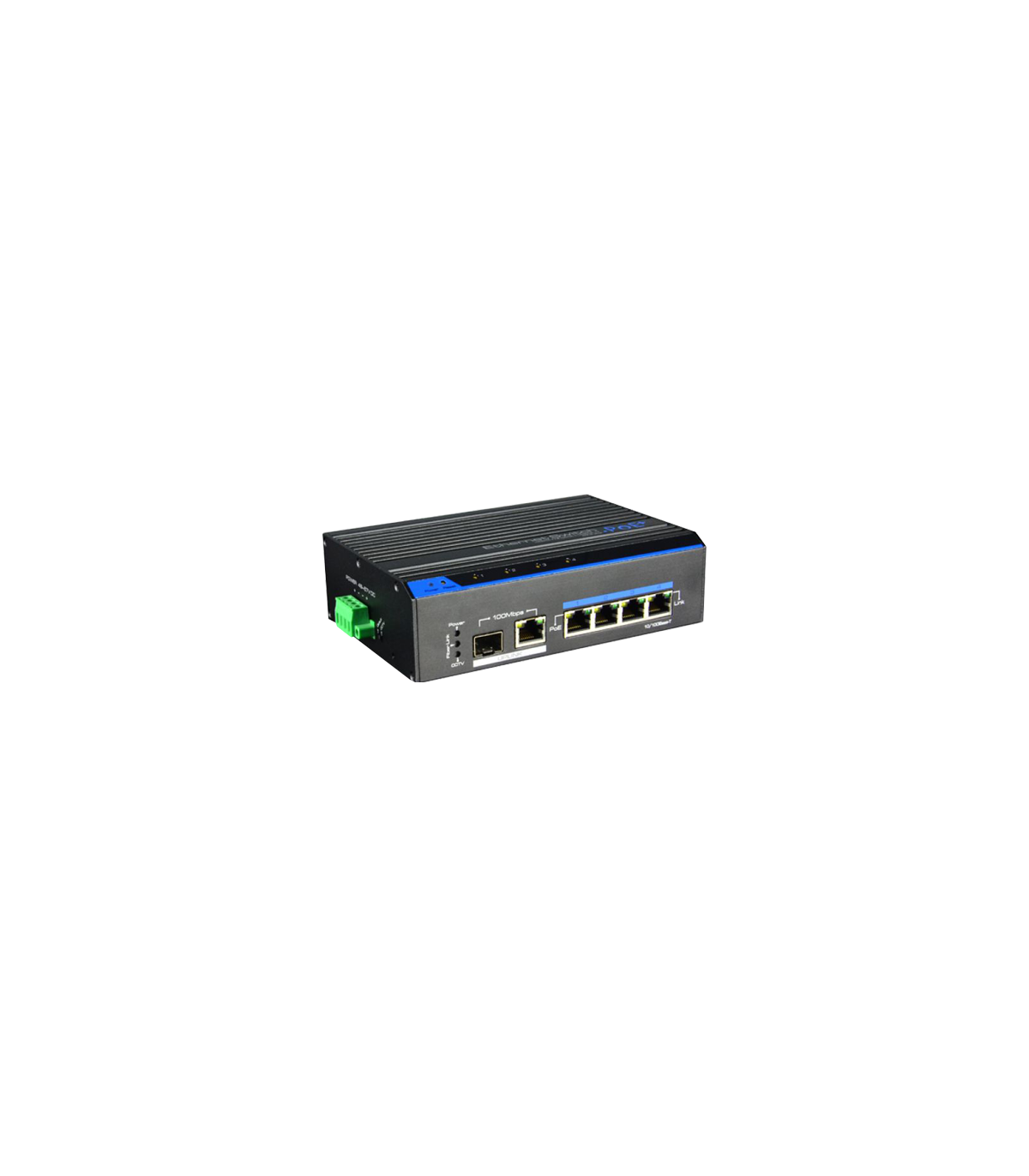 Switch PoE Industrial special conceput pentru sisteme de supraveghere IP, ce permite transferul de date cu viteze de 10/100 Mbps si dispune de 4 porturi PoE+ si un port de uplink RJ45 10/100Mbs + 1 port SFP 10/100Base-TX.